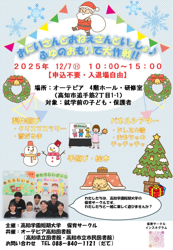 高知学園短期大学保育サークルのお兄さんお姉さんによる冬の楽しいイベントのお知らせです。