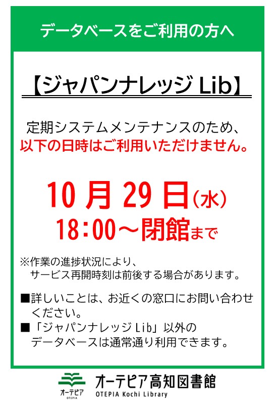 【10/29(水)18時~】「ジャパンナレッジLib」の一時停止について