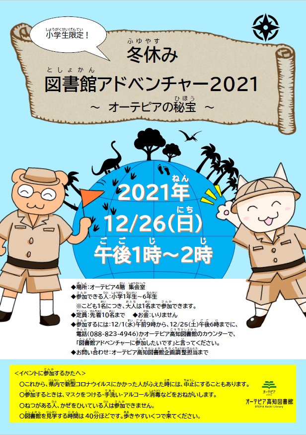 12月1日(水)午前9時から12月25日(土)午後6時までにお電話(TEL:088-823-4946)もしくはオーテピア高知図書館のカウンターで「図書館アドベンチャーに参加したいです」とお伝えください。