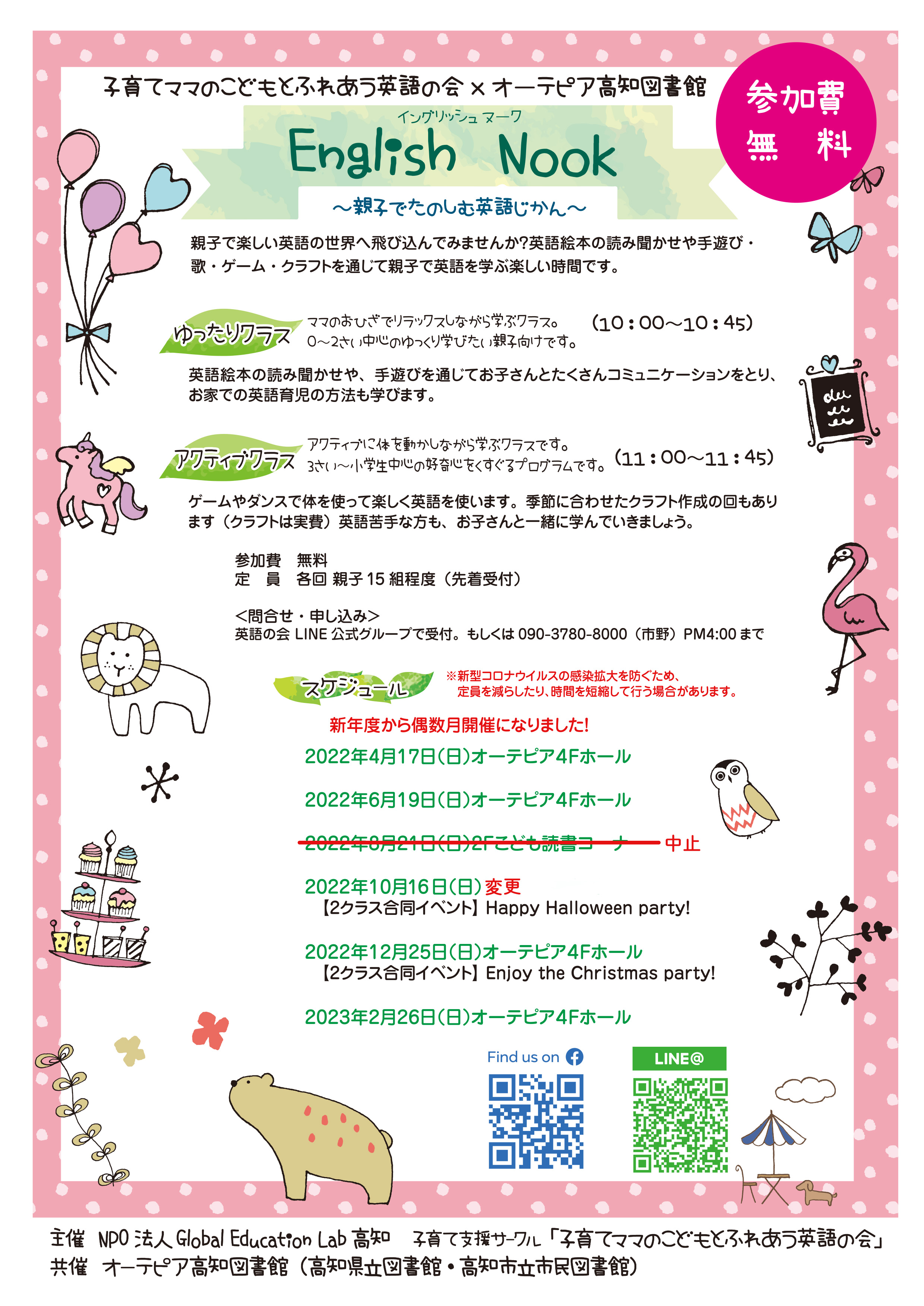 主催は、NPO法人 Global Education Lab 高知 子育て支援サークル「子育てママのこどもとふれあう英語の会」さん。