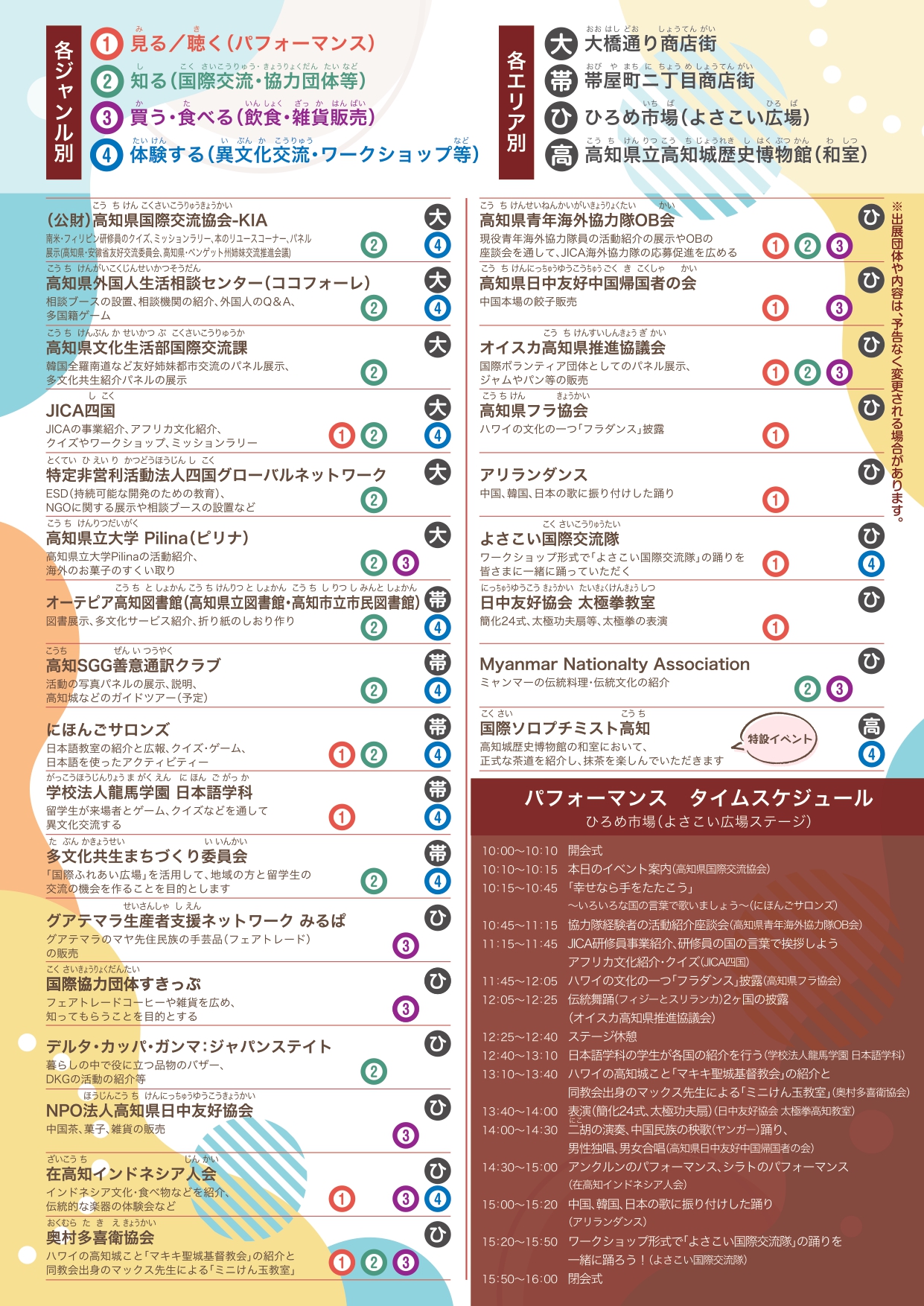 外国の食べ物や飲み物の販売、よさこい広場ステージでの歌や踊りの披露など、いろいろな国や地域の文化を体験し、交流できるイベントです。
