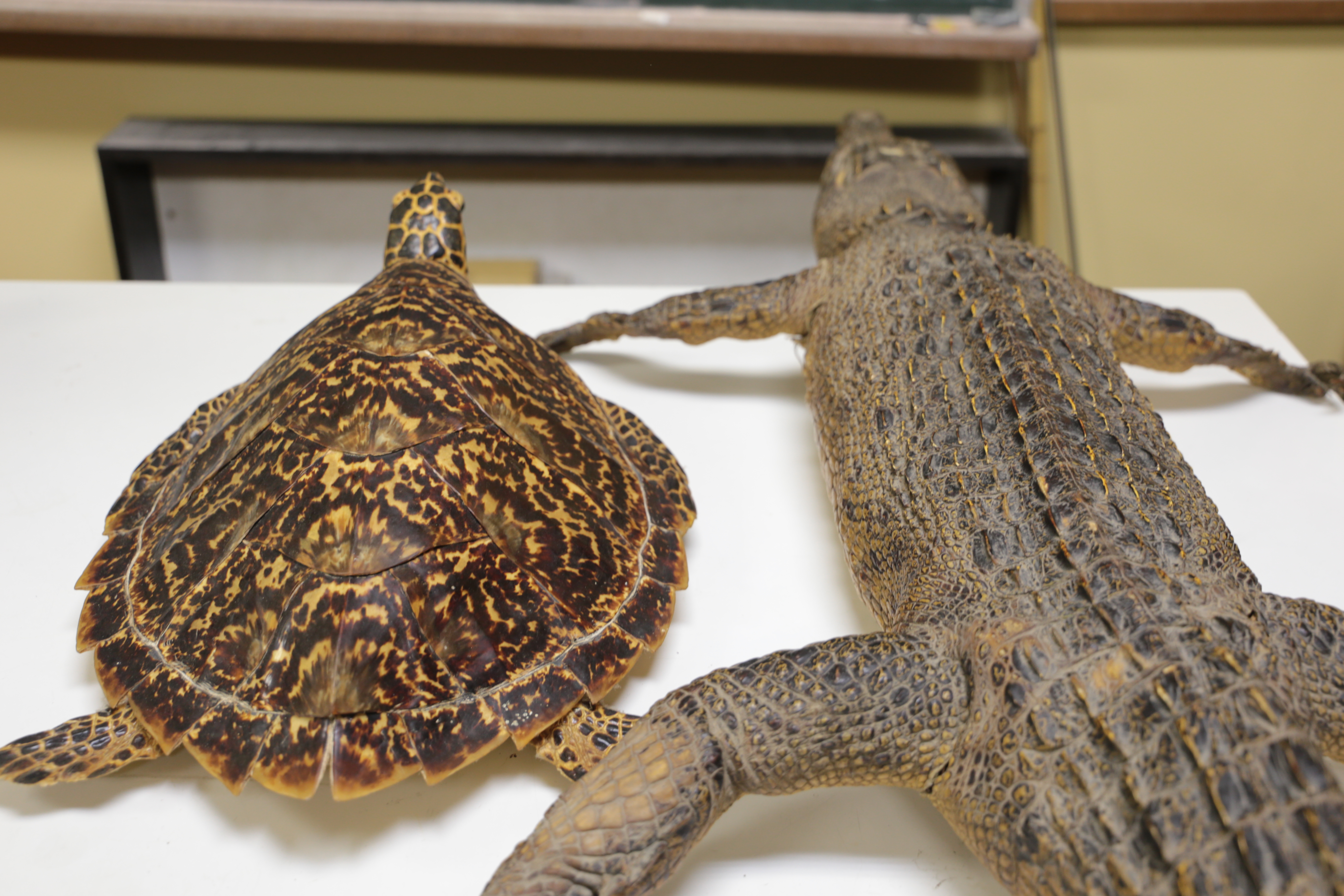 剥製(はくせい)となった生きものを触って、毛並みやうろこの手ざわり、爪の鋭さなどを確かめます。