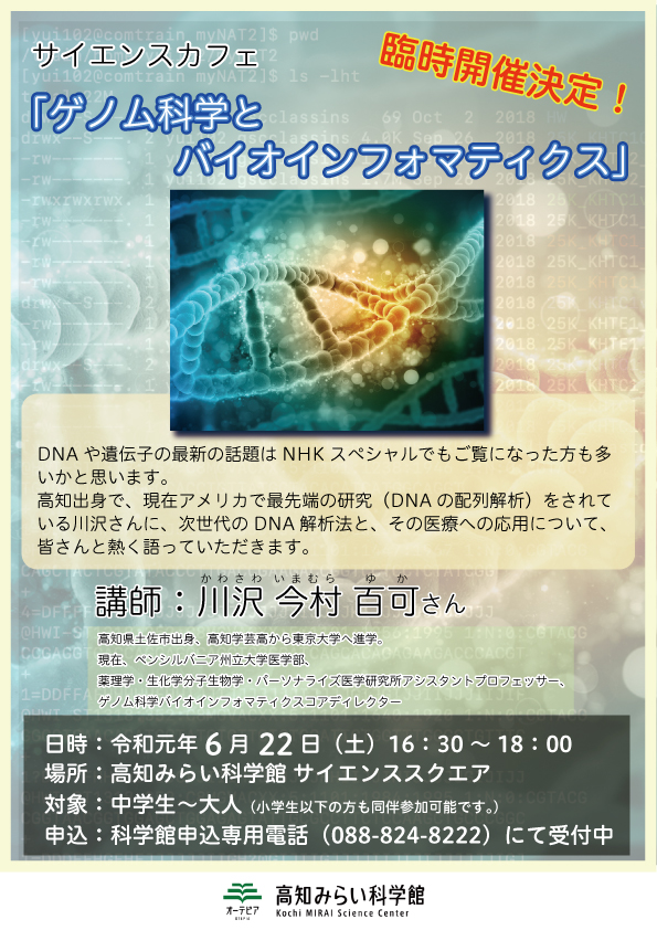 高知出身で、現在アメリカで最先端の研究(DNAの配列解析)をされている川沢さんに、次世代のDNA解析法と、その医療への応用について、皆さんと熱く語っていただきます。