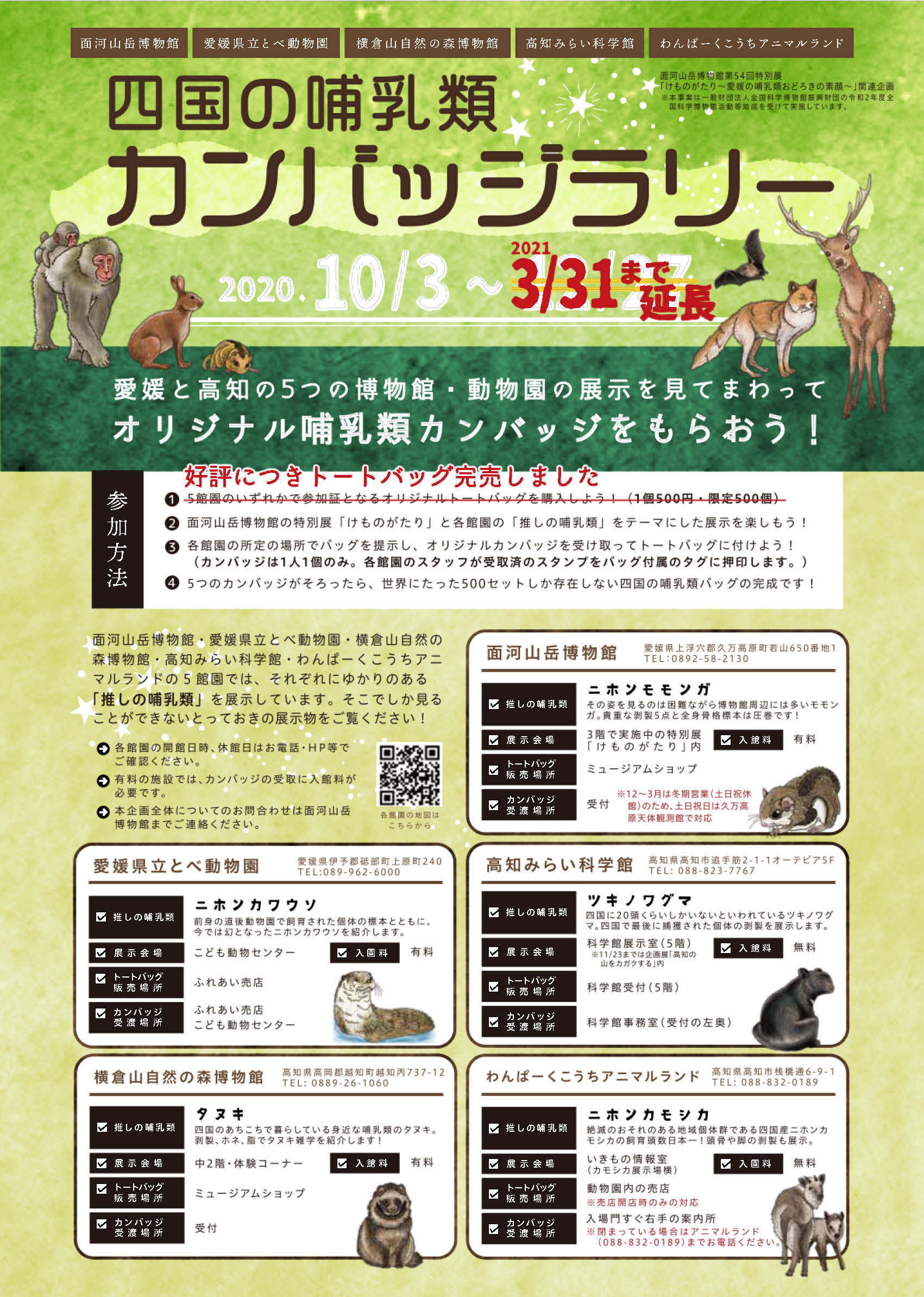 高知県と愛媛県の5つの博物館と動物園を巡ってオリジナルカンバッジを集める「四国の哺乳類カンバッジラリー」を開催します。