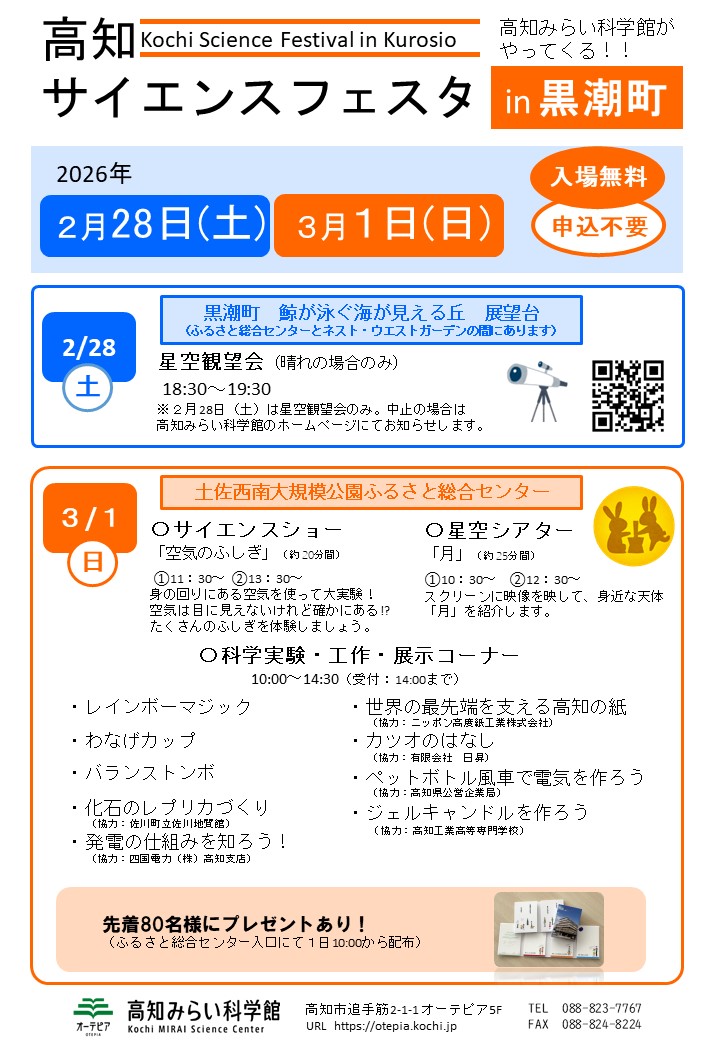 サイエンスショーや星空シアター、実験・工作コーナーなど、科学体験が盛りだくさんのイベントを黒潮町で実施します。